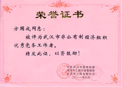 2011年6月,黨委書記方國成同志被評為武漢市非公有制經(jīng)濟組織優(yōu)秀黨務工作者