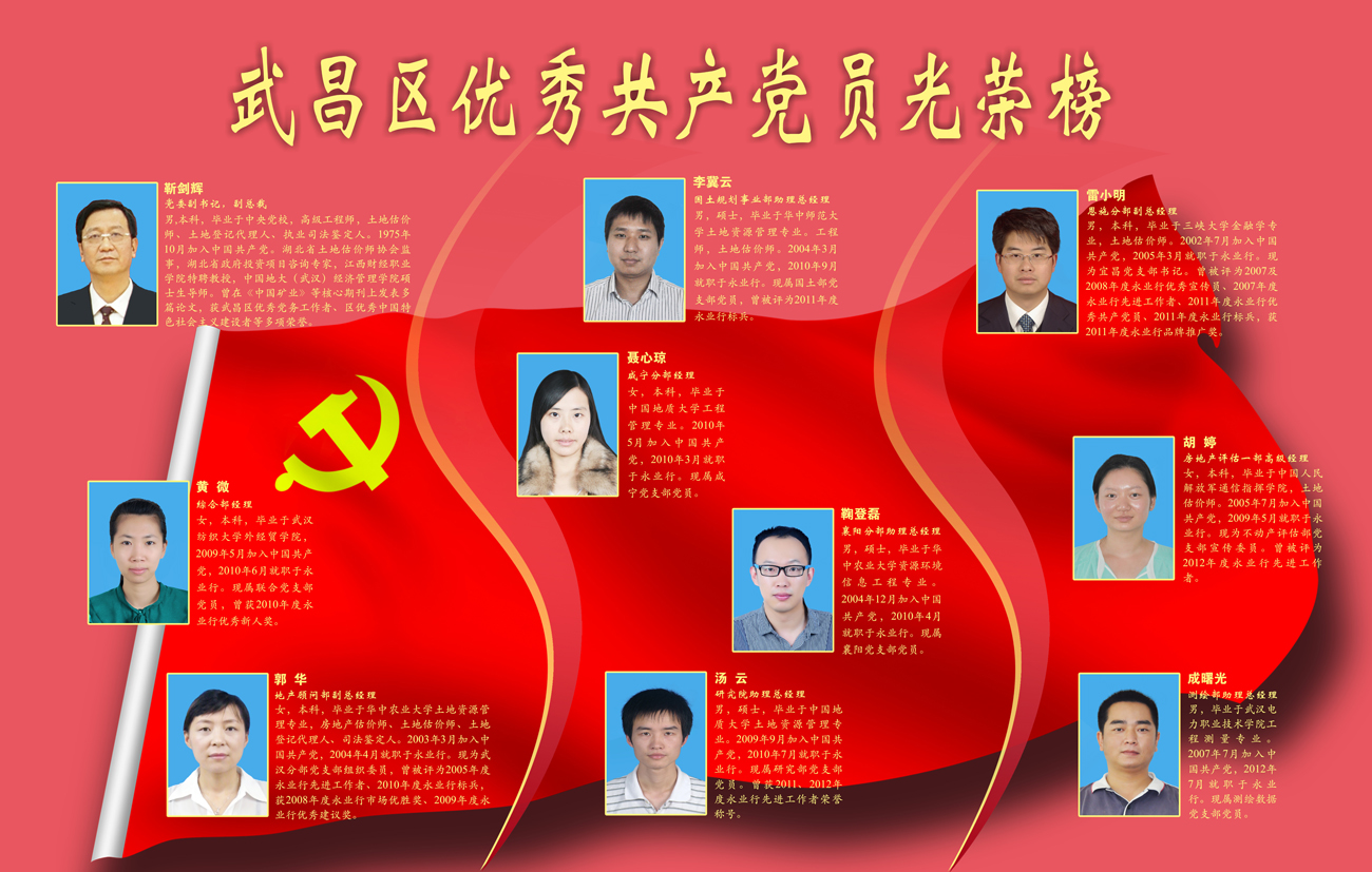 2013年7月,靳劍輝、黃微、郭華、聶心瓊、李冀云、鞠登磊、湯云、成曙光、胡婷、雷小明10名同志被評為武昌區(qū)“優(yōu)秀共產(chǎn)黨員”