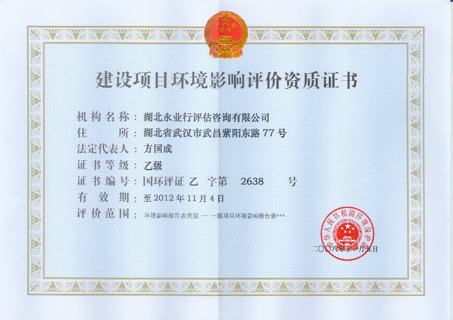 近日,永業(yè)行取得了由環(huán)境保護部頒發(fā)的乙級建設項目環(huán)境影響評價資質證,證書編號為國環(huán)評證乙字第2638號。自此,永業(yè)行可獨立為客戶提供建設項目環(huán)境影響評價業(yè)務服務。在此之前,永業(yè)行曾與其他機構合作完成多項環(huán)境影響評價項目。