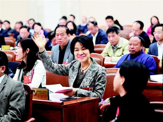 圖為:李燕萍舉手要求提問。﹙湖北日報全媒記者張朋攝﹚
