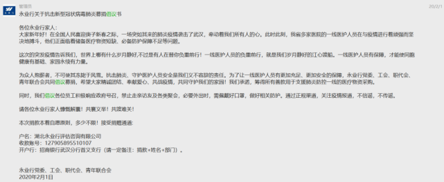 “為眾人抱薪者,不可使其凍斃于風(fēng)雪??箵舴窝住⑹刈o(hù)醫(yī)護(hù)人員安全是我們義不容辭的責(zé)任。為了讓一線醫(yī)護(hù)人員有更加充足、更加安全的保障,永業(yè)行黨委、工會、職代會、青年聯(lián)合會共同倡議募捐,希望大家精誠團(tuán)結(jié)、奉獻(xiàn)愛心、共戰(zhàn)疫情,共同守護(hù)我們的家園!”2月1日,一封募捐倡議在永業(yè)行工作群內(nèi)發(fā)布。潘世炳帶頭捐款,全體黨員和各地員工也迅速響應(yīng),不到48小時,收到約700名員工共計20余萬元捐款。截至2月17日,永業(yè)行及千余名員工累計籌得善款近40萬元,陸續(xù)匯入武昌區(qū)慈善總會等慈善機(jī)構(gòu),期望通過點(diǎn)滴愛心,為戰(zhàn)勝疫情盡永業(yè)行綿薄之力。