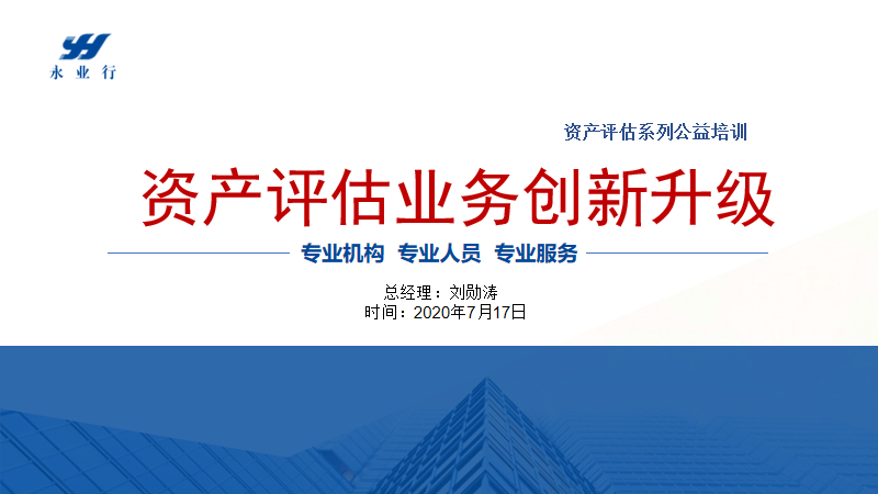 2020年7月17日,湖北省資產(chǎn)評估協(xié)會舉辦《后疫情時期湖北省資產(chǎn)評估行業(yè)公益講座》,永業(yè)行資產(chǎn)評估部總經(jīng)理劉勛濤受邀參會,并圍繞資產(chǎn)評估業(yè)務(wù)創(chuàng)新升級作主題演講。湖北省內(nèi)眾多行業(yè)專家、資產(chǎn)評估機構(gòu)負責(zé)人及評估從業(yè)人員通過騰訊會議APP線上參加了此次研討會。