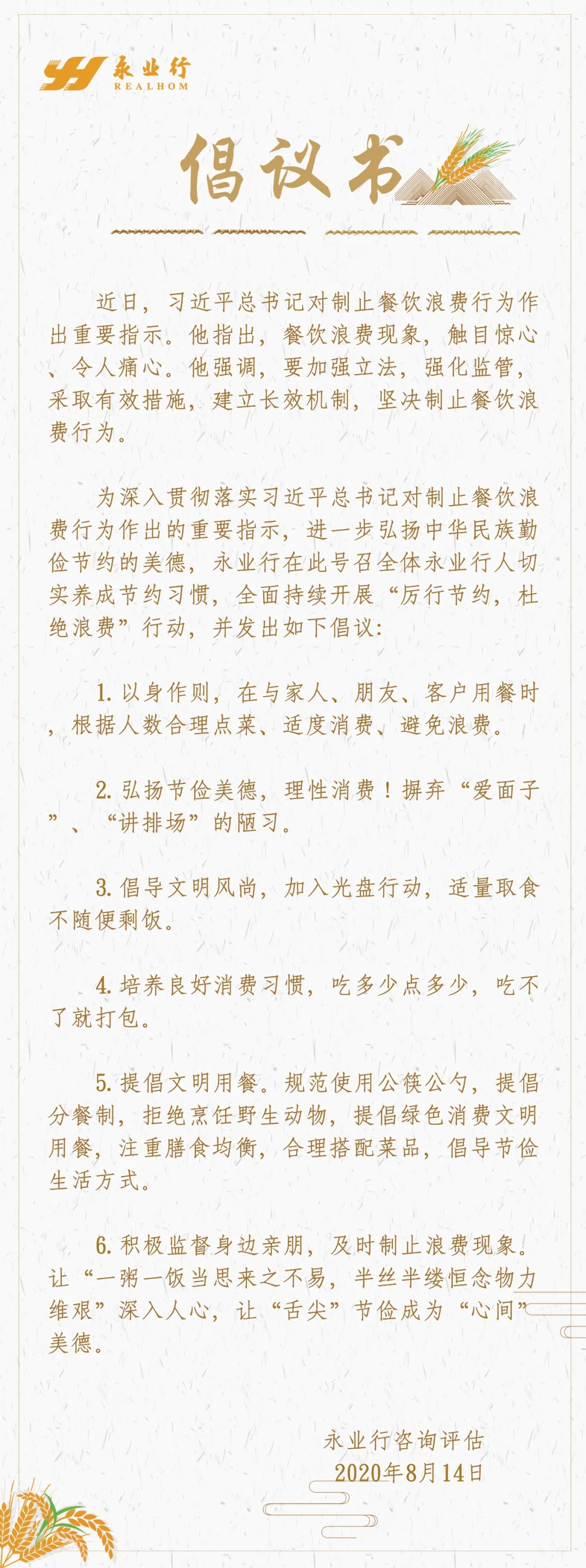 永業(yè)行關于“堅決制止餐飲浪費行為”的倡議書