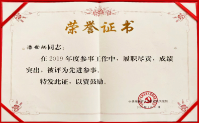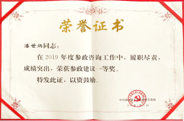 2020年7月,中共湖北省政府機(jī)關(guān)黨組印發(fā)《關(guān)于表彰2019年度先進(jìn)參事和參事工作單項(xiàng)獎(jiǎng)獲獎(jiǎng)參事的通報(bào)》,省政府參事、永業(yè)行董事長(zhǎng)潘世炳榮獲先進(jìn)參事、參政建議一等獎(jiǎng)。