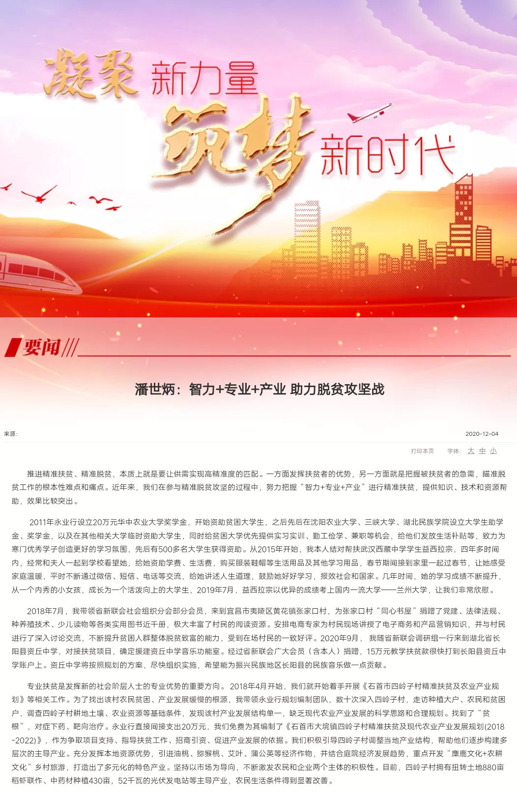 2020年12月4日,湖北省政協(xié)委員、省政府參事、永業(yè)行董事長(zhǎng)潘世炳結(jié)合自身扶貧工作體會(huì),撰寫了《智力+專業(yè)+產(chǎn)業(yè)?助力脫貧攻堅(jiān)戰(zhàn)》,獲中央統(tǒng)戰(zhàn)部網(wǎng)站全文刊載。