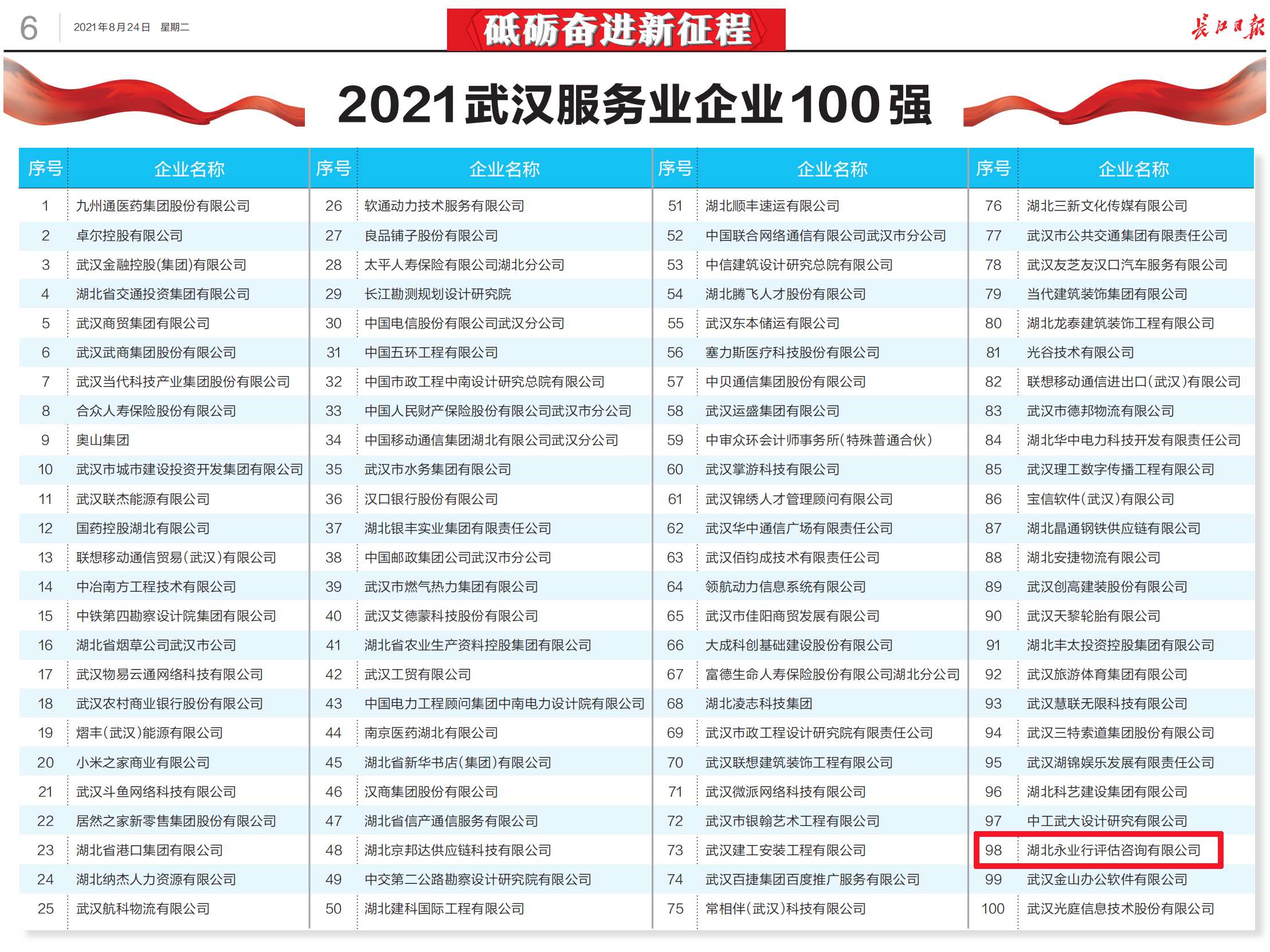 2021年8月23日,2021武漢企業(yè)100強(qiáng)榜單正式發(fā)布,永業(yè)行憑借良好的發(fā)展態(tài)勢(shì)和經(jīng)營業(yè)績,連續(xù)四年上榜“武漢服務(wù)業(yè)企業(yè)100強(qiáng)”。