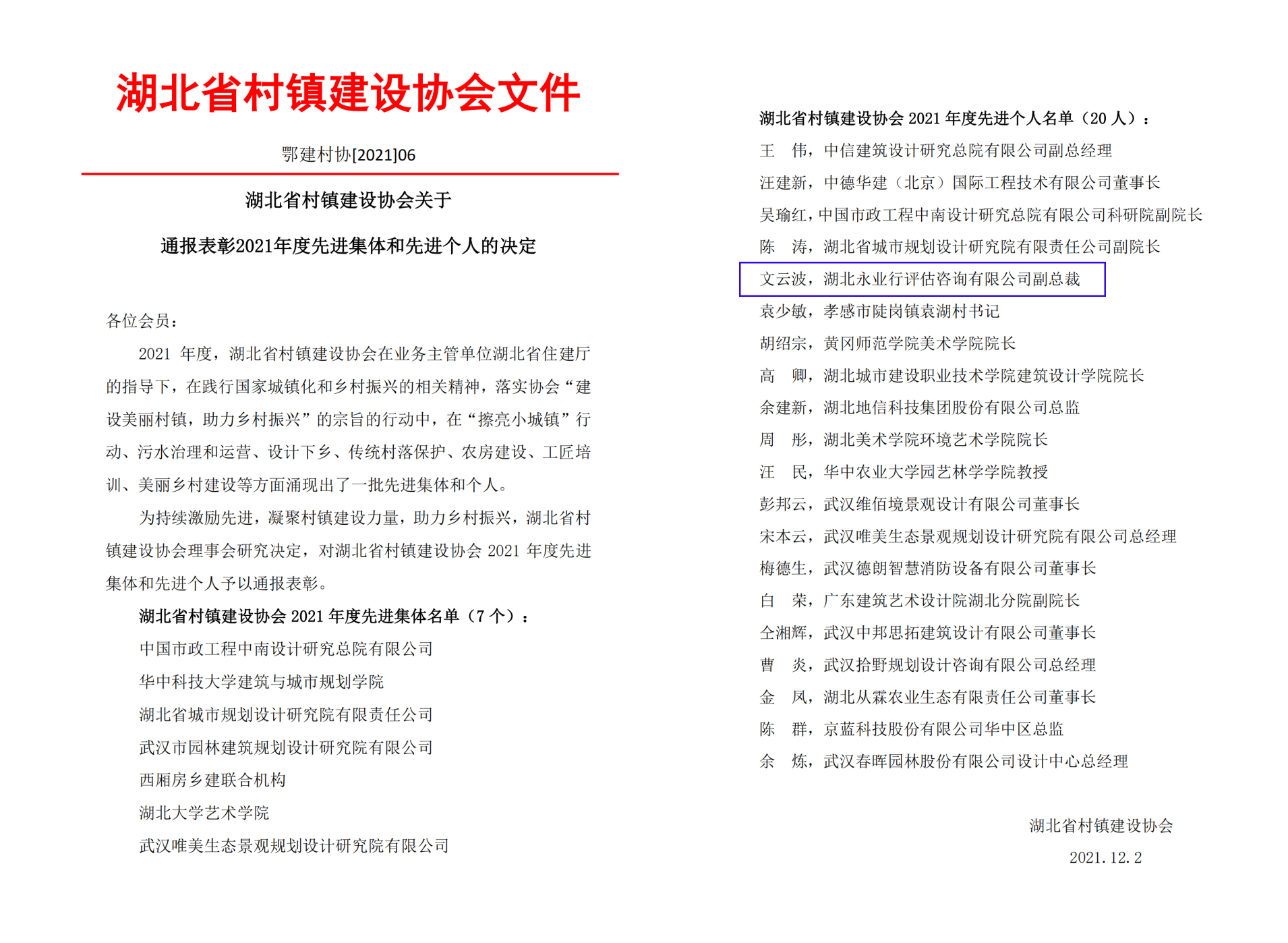 2021年12月7日,湖北省村鎮(zhèn)建設(shè)協(xié)會(huì)(下稱“協(xié)會(huì)”)2021年會(huì)暨村鎮(zhèn)建設(shè)經(jīng)驗(yàn)專題分享會(huì)在武漢召開(kāi)。湖北省住建廳村鎮(zhèn)處相關(guān)領(lǐng)導(dǎo)、協(xié)會(huì)會(huì)長(zhǎng)孟勇、各會(huì)員單位以及省內(nèi)相關(guān)市州村鎮(zhèn)建設(shè)主管部門有關(guān)同志參加會(huì)議。協(xié)會(huì)副會(huì)長(zhǎng)、永業(yè)行副總裁文云波參加會(huì)議并獲評(píng)“湖北省村鎮(zhèn)建設(shè)協(xié)會(huì)2021年度先進(jìn)個(gè)人”。