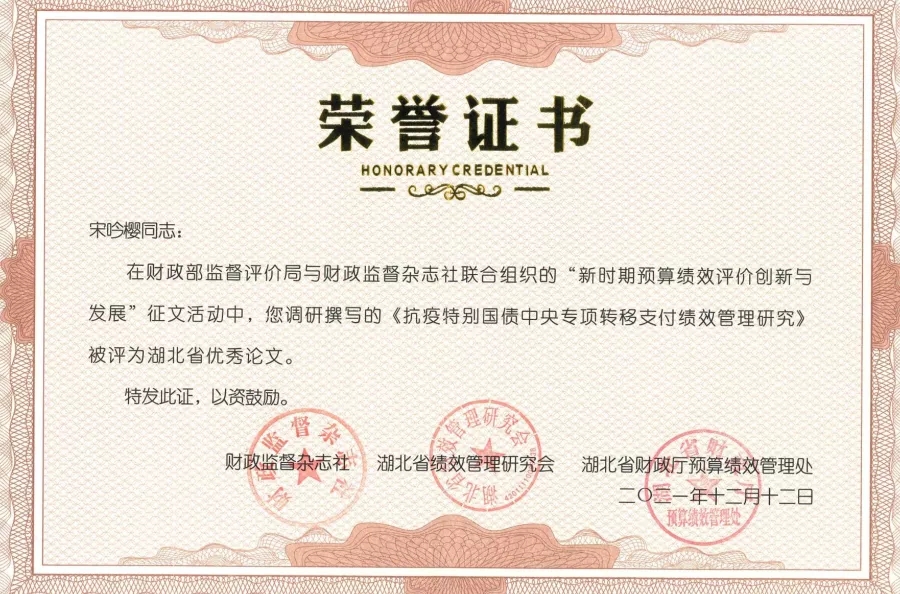 2021年12月12日,“設(shè)立‘湖北績(jī)效日’倡議活動(dòng)”在武漢舉辦,國內(nèi)學(xué)術(shù)及研究領(lǐng)域?qū)<覍W(xué)者、各級(jí)財(cái)政及行政部門人員、第三方機(jī)構(gòu)實(shí)踐專家參會(huì)。會(huì)上,對(duì)“新時(shí)期預(yù)算績(jī)效評(píng)價(jià)創(chuàng)新與發(fā)展”征文活動(dòng)進(jìn)行了頒獎(jiǎng),永業(yè)行財(cái)稅咨詢技術(shù)副總監(jiān)宋吟櫻調(diào)研撰寫的《抗疫特別國債中央專項(xiàng)轉(zhuǎn)移支付績(jī)效管理研究》獲評(píng)湖北省優(yōu)秀論文。