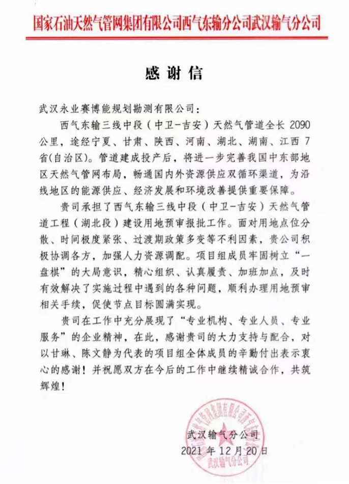 2021年12月20日,國(guó)家石油天然氣管網(wǎng)集團(tuán)有限公司(下稱“國(guó)家管網(wǎng)公司”)西氣東輸分公司武漢輸氣分公司致函永業(yè)行,對(duì)我司承擔(dān)的西氣東輸三線中段(中衛(wèi)-吉安)天然氣管道工程(湖北段)建設(shè)用地預(yù)審工作給予肯定和感謝。