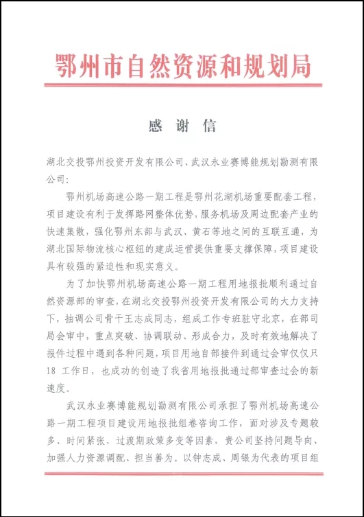 歲末年初,永業(yè)行陸續(xù)收到國家石油天然氣管網(wǎng)集團(tuán)有限公司武漢輸氣分公司、湖北交投孝漢應(yīng)高速公路有限公司及鄂州市自然資源和規(guī)劃局發(fā)來的感謝信。信中對永業(yè)行以高質(zhì)量、高效能提供的技術(shù)服務(wù),以及展現(xiàn)出的永業(yè)行人的責(zé)任和擔(dān)當(dāng)予以肯定和表揚(yáng)。滿載的贊賞和鼓勵(lì),既是對項(xiàng)目團(tuán)隊(duì)辛勤付出的高度認(rèn)可,亦是對公司品質(zhì)履約的充分肯定。