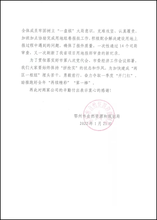 吳品涵、閆娟、李海橋、陳文靜為代表的項(xiàng)目組全體成員精心組織、認(rèn)真履責(zé)、加班加點(diǎn)協(xié)助完成了用地組卷工作,配合項(xiàng)目業(yè)主多次到自然資源部、省自然資源廳做好耐心細(xì)致地匯報(bào)工作,及時(shí)有效解決了實(shí)施過程中遇到的各種問題,以最短時(shí)間順利拿到了項(xiàng)目國務(wù)院用地批文,促使項(xiàng)目依法開工建設(shè)。