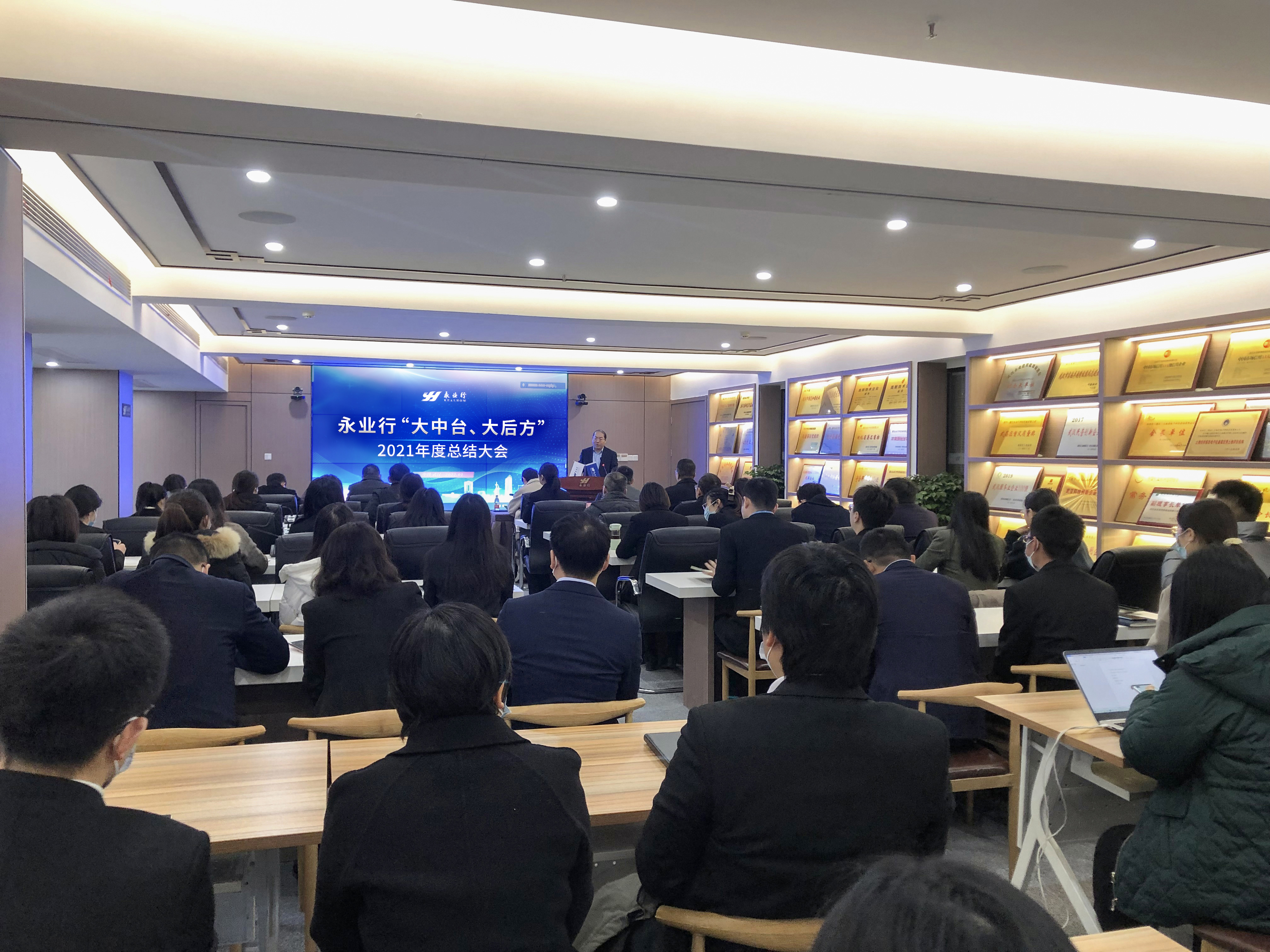 2022年1月7日,永業(yè)行召開2021年度“大中臺(tái)大后方”總結(jié)會(huì)。董事長(zhǎng)潘世炳,輪值總裁王琴及公司高管,全體職能人員通過(guò)線上線下參加了會(huì)議。會(huì)議由副總裁吳學(xué)鋒主持。