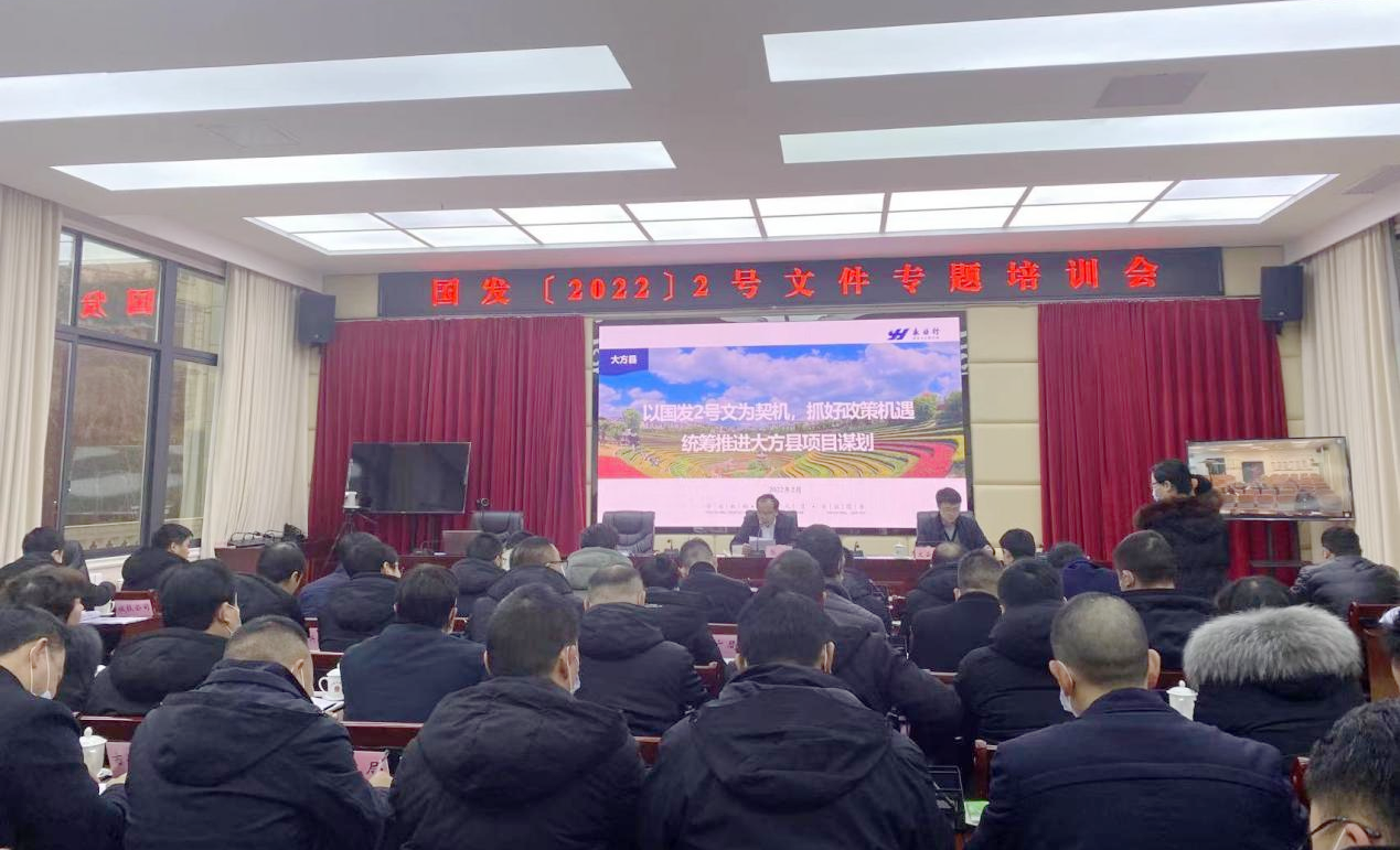 2022年2月24日,永業(yè)行副總裁文云波應(yīng)邀為大方縣作“以國發(fā)2號文為契機,抓好政策機遇,統(tǒng)籌推進大方縣項目謀劃”專題交流培訓(xùn)。大方縣委常委、常務(wù)副縣長張銘出席并主持會議。