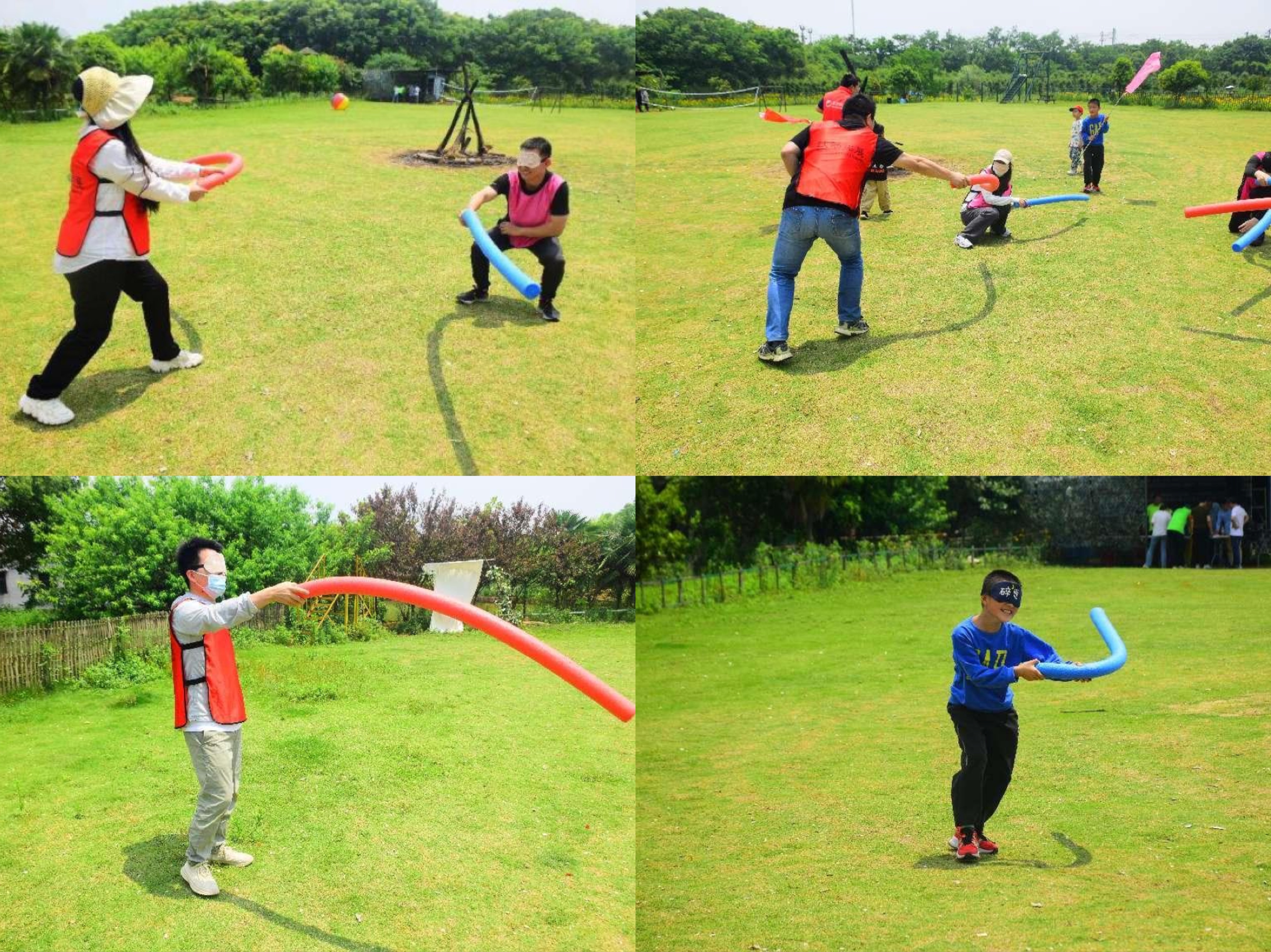 當(dāng)蒙住眼睛只能靠聽覺來行動(dòng)時(shí),隊(duì)友之間是否有足夠的信任來配合完成任務(wù)呢?每隊(duì)每次排出兩名“蒙眼大俠”,手持道具的劍,聽從自己組員的指令行動(dòng),首先擊中對(duì)手身體的任何部位為勝利?;靵y的場(chǎng)地中,努力分辨來自隊(duì)友的指令,最終兩隊(duì)打成平手,充分享受游戲樂趣。