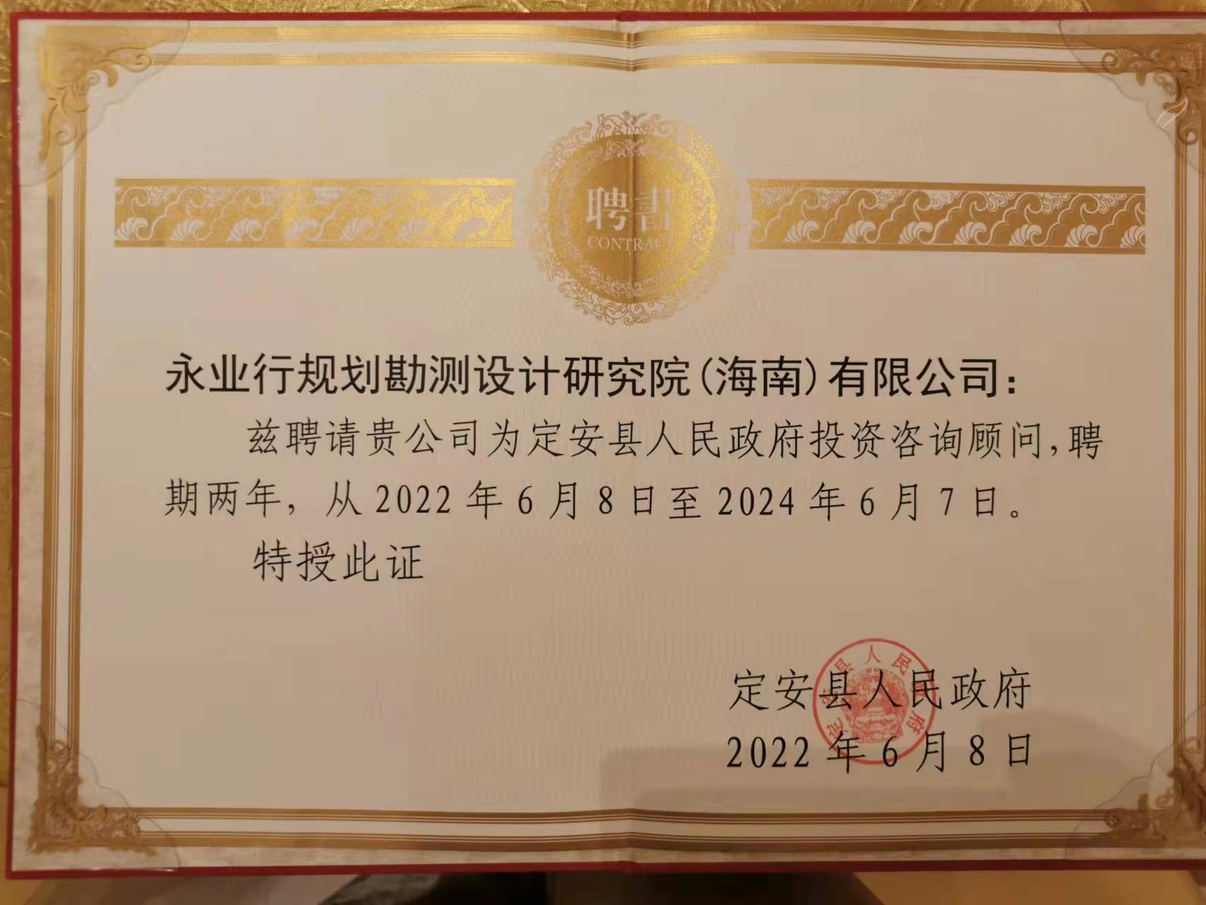 2022年7月1日,海南省定安縣舉行招商引資重點(diǎn)項(xiàng)目簽約及定安縣政府顧問(wèn)聘任儀式,永業(yè)行受聘為定安縣政府投資咨詢顧問(wèn),聘期兩年。定安縣委書記劉峰松,縣委副書記、縣長(zhǎng)馮云飛,縣委常委、副縣長(zhǎng)黃海鵠等參加會(huì)議。