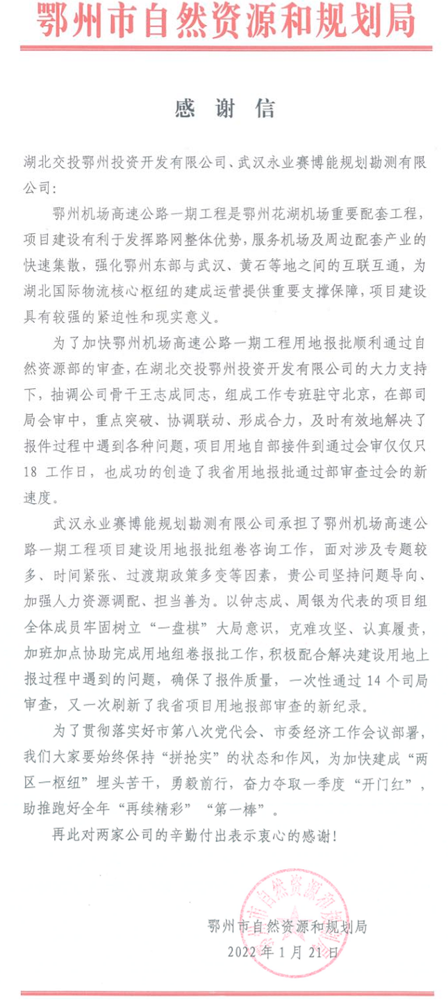 2017年6月我司開(kāi)始為鄂州機(jī)場(chǎng)提供用地咨詢服務(wù)。由于項(xiàng)目用地規(guī)模較大、行業(yè)跨度較大、功能分區(qū)復(fù)雜,技術(shù)團(tuán)隊(duì)先后去成都天府機(jī)場(chǎng)以及北京民航向?qū)<艺?qǐng)教學(xué)習(xí)。并于2018年11月取得了自然資源部用地預(yù)審批復(fù),緊接著在2020年4月取得了國(guó)務(wù)院用地批復(fù)。同時(shí)也為鄂州機(jī)場(chǎng)對(duì)外連接的主要通道-鄂州機(jī)場(chǎng)高速一期工程提供專業(yè)服務(wù),順利取得了國(guó)務(wù)院及自然資源部用地預(yù)審批復(fù)。除此之外我司還成功為鄂黃第二過(guò)江通道、鄂咸高速、新港高速、武陽(yáng)高速等重大基礎(chǔ)設(shè)施項(xiàng)目提供了用地咨詢服務(wù)。2022年1月鄂州市自然資源和規(guī)劃局向我司發(fā)來(lái)了感謝信。