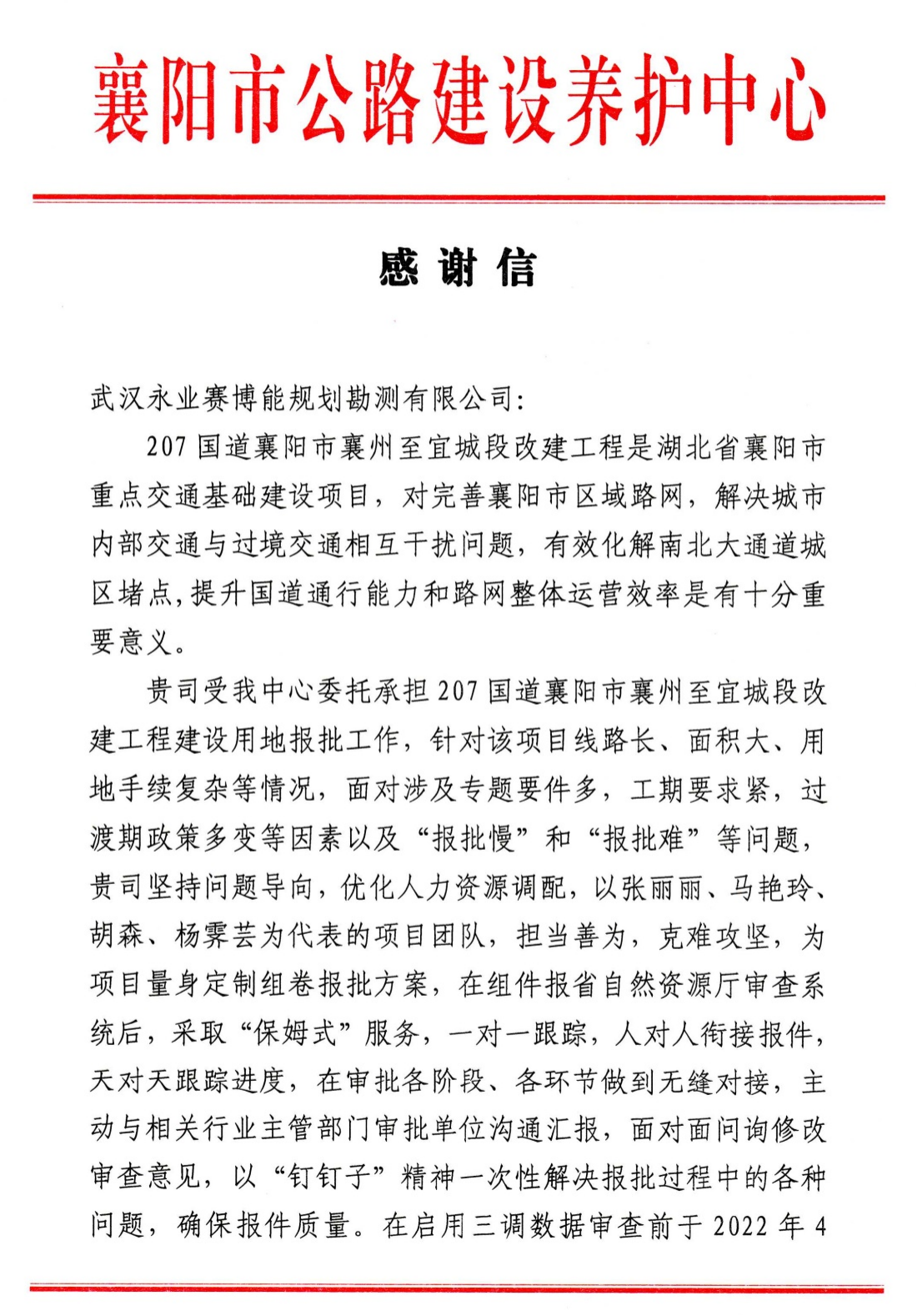 2022年7月27日,襄陽(yáng)市公路建設(shè)養(yǎng)護(hù)中心致函永業(yè)行,對(duì)我司承擔(dān)的207國(guó)道襄陽(yáng)市襄州至宜城段改建工程建設(shè)用地報(bào)批工作給予肯定和感謝。