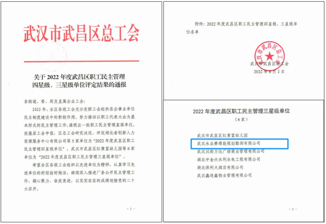 近日,武漢市武昌區(qū)總工會(huì)發(fā)布 《關(guān)于2022年度武昌區(qū)職工民主管理四星級(jí)、三星級(jí)單位評(píng)定結(jié)果的通報(bào)》,永業(yè)行獲評(píng)“2022年度武昌區(qū)職工民主管理三星級(jí)單位”。