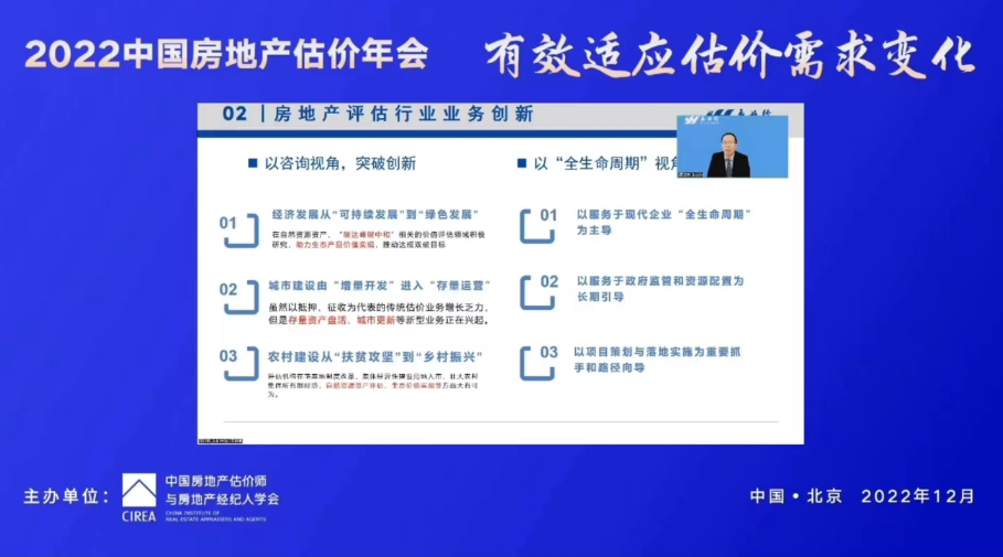 潘世炳在演講中結(jié)合黨的二十大精神以及國(guó)際國(guó)內(nèi)宏觀經(jīng)濟(jì)形勢(shì),分享了他對(duì)構(gòu)建房地產(chǎn)評(píng)估行業(yè)發(fā)展新格局的思考。他對(duì)房地產(chǎn)評(píng)估行業(yè)發(fā)展的新形勢(shì)、新要求進(jìn)行分析,提出房地產(chǎn)評(píng)估行業(yè)要以傳統(tǒng)評(píng)估和咨詢(xún)業(yè)務(wù)為基礎(chǔ),衍生新的業(yè)務(wù)渠道,構(gòu)建房地產(chǎn)評(píng)估行業(yè)發(fā)展的新格局。他指出房地產(chǎn)評(píng)估行業(yè)可從咨詢(xún)視角出發(fā),圍繞“綠色發(fā)展”“存量運(yùn)營(yíng)”等方面進(jìn)行業(yè)務(wù)創(chuàng)新;以服務(wù)現(xiàn)代企業(yè)“全生命周期”為主導(dǎo),實(shí)現(xiàn)傳統(tǒng)業(yè)務(wù)的提質(zhì)升級(jí)。他同時(shí)提出,為做好估價(jià)機(jī)構(gòu)內(nèi)部管理,評(píng)估機(jī)構(gòu)應(yīng)不斷豐富技術(shù)、市場(chǎng)、風(fēng)控、管理、信息化、文化“六位一體”的管理體系,以管理創(chuàng)新作為推動(dòng)評(píng)估行業(yè)發(fā)展的新舉措。