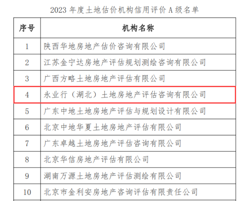 12月23日,中國土地估價(jià)師與土地登記代理人協(xié)會(huì)(下稱“中估協(xié)”)發(fā)布“2023年度A級資信土地評估中介機(jī)構(gòu)名單”,此次公布榮獲A級資信的土地評估中介機(jī)構(gòu)共120家。永業(yè)行位列全國第四、湖北第一,連續(xù)15年獲評“土地估價(jià)機(jī)構(gòu)信用評價(jià)A級”。