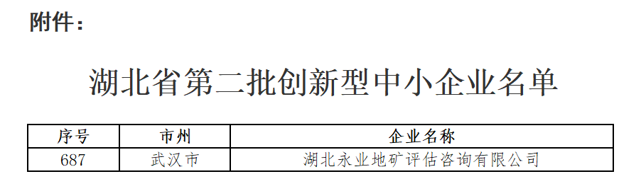 2月27日,湖北省經(jīng)信廳公布湖北省第二批創(chuàng)新型中小企業(yè)名單,永業(yè)行成員機(jī)構(gòu)湖北永業(yè)地礦評估咨詢有限公司位列其中!