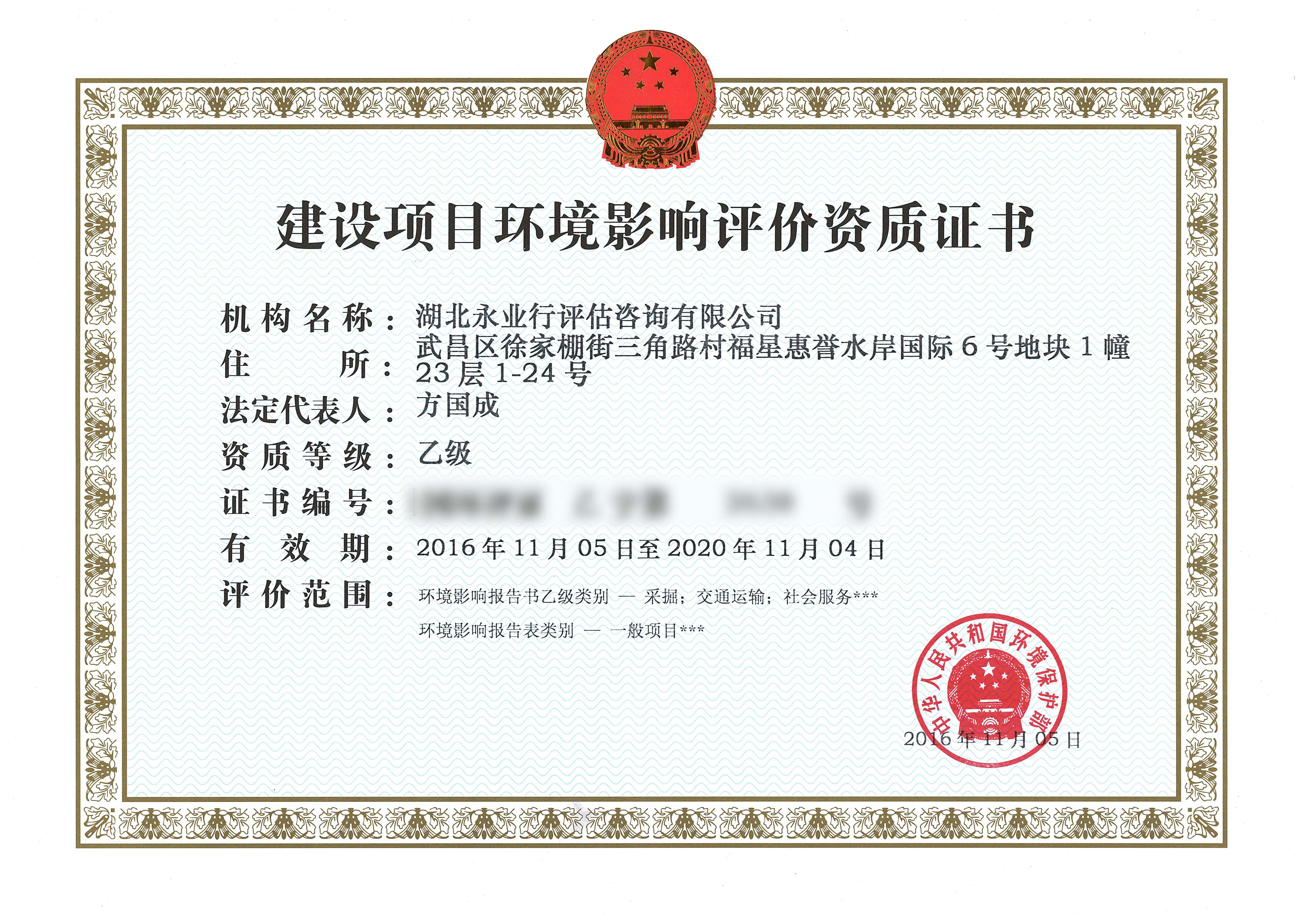 建設(shè)項目環(huán)境影響評價乙級資質(zhì)證書