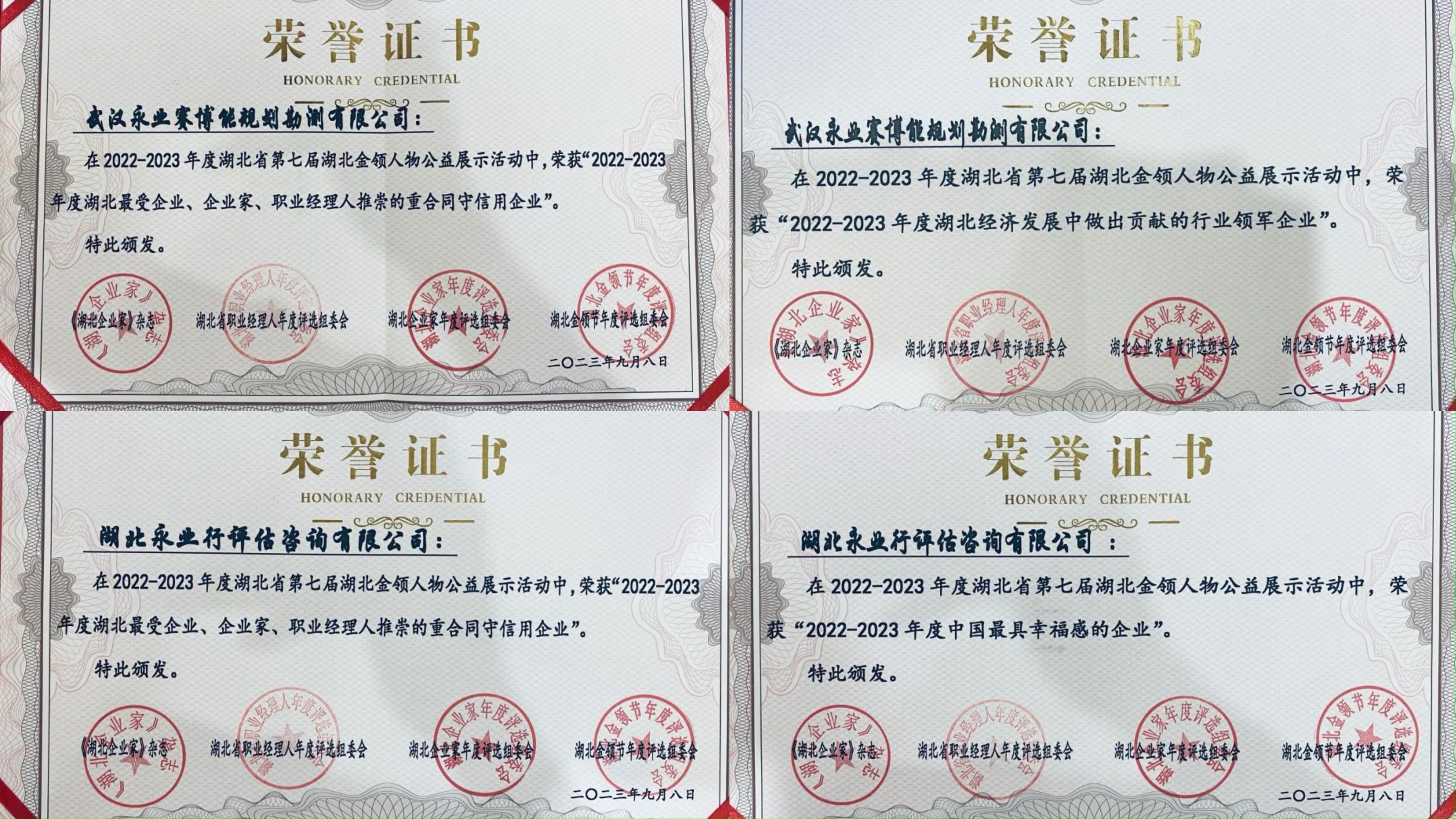公司多人榮獲2022-2023 年度湖北慈善企業(yè)家、職業(yè)經(jīng)理人、金領(lǐng)人士、湖北經(jīng)濟(jì)發(fā)展中做出貢獻(xiàn)的行業(yè)領(lǐng)軍企業(yè)家、湖北經(jīng)濟(jì)發(fā)展中做出貢獻(xiàn)的行業(yè)領(lǐng)軍職業(yè)經(jīng)理人、湖北杰出經(jīng)理人、湖北優(yōu)秀職業(yè)經(jīng)理人等榮譽(yù)。