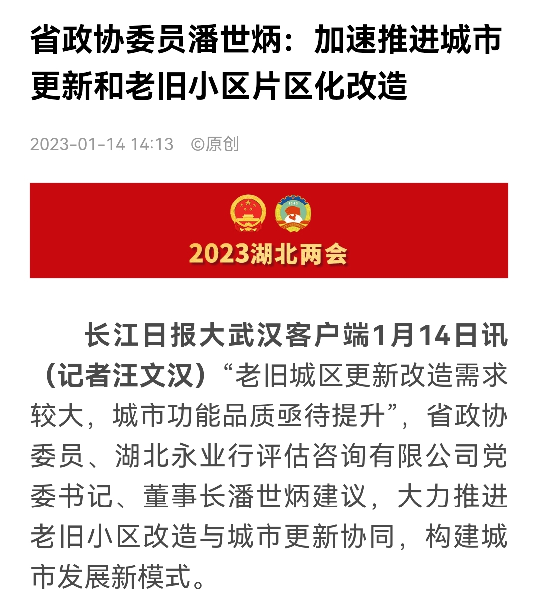 2023年1月,潘世炳向湖北省政協(xié)十三屆一次會(huì)議提交了《老舊小區(qū)連片改造 推進(jìn)城市更新升級(jí)》提案,獲湖北日?qǐng)?bào)、湖北衛(wèi)視、湖北經(jīng)視、長(zhǎng)江日?qǐng)?bào)、長(zhǎng)江云等多家媒體報(bào)道。提案中指出,我省城建發(fā)展還存在一些不足,比如城市功能品質(zhì)亟待提升、市政基礎(chǔ)設(shè)施老化破損的改造需求較大、老舊城區(qū)更新改造需求較大、對(duì)市場(chǎng)化資金撬動(dòng)力度需加強(qiáng)。提案建議從加速推進(jìn)城市更新和老舊小區(qū)片區(qū)化改造、引導(dǎo)多主體協(xié)同推進(jìn)、打通項(xiàng)目多元化資金籌措渠道等方面著手,大力推進(jìn)老舊小區(qū)改造與城市更新協(xié)同,構(gòu)建城市發(fā)展新模式。