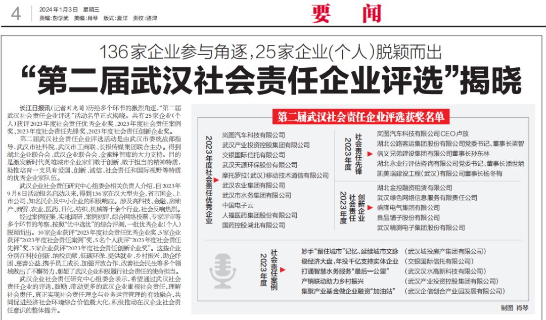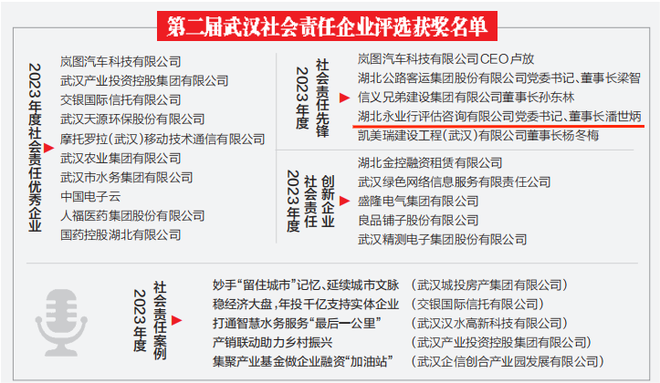 歷經多個環(huán)節(jié)的激烈角逐,2024年1月3日,“武漢第二屆社會責任企業(yè)評選”活動名單在長江日報正式刊登揭曉,25家企業(yè)(個人)脫穎而出。永業(yè)行黨委書記、董事長潘世炳榮獲2023年度社會責任先鋒獎。
