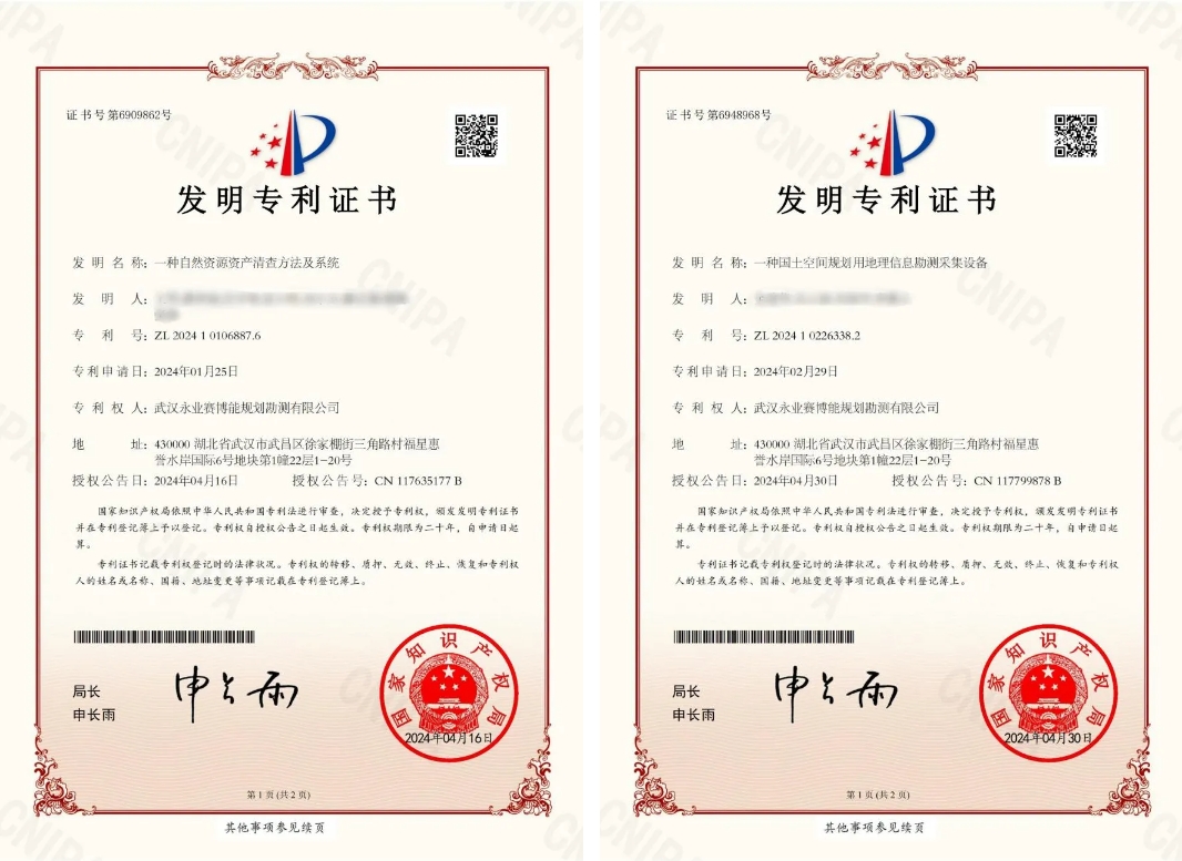 近日,永業(yè)行申報的發(fā)明專利《一種自然資源資產(chǎn)清查方法及系統(tǒng)》《一種國土空間規(guī)劃用地理信息勘測采集設(shè)備》獲得國家知識產(chǎn)權(quán)局授權(quán),為公司的創(chuàng)新發(fā)展再添新動力。