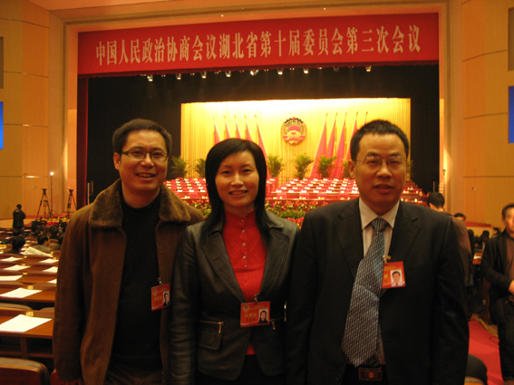 圖為總裁潘世炳與武漢市人民檢察院副檢察長周佳念(左)、武漢理工大學博導陳曉芳(中)教授在政協(xié)會上合影