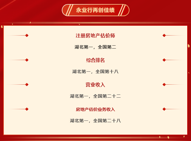 2024年9月9日,中國(guó)房地產(chǎn)估價(jià)師與房地產(chǎn)經(jīng)紀(jì)人學(xué)發(fā)布《關(guān)于發(fā)布2023年度全國(guó)一級(jí)房地產(chǎn)估價(jià)機(jī)構(gòu)有關(guān)情況的公告》(中房學(xué)〔2024〕34號(hào)),永業(yè)行再創(chuàng)佳績(jī),綜合情況全國(guó)領(lǐng)先,湖北第一,營(yíng)業(yè)收入與房地產(chǎn)估價(jià)業(yè)務(wù)收入雙提升。