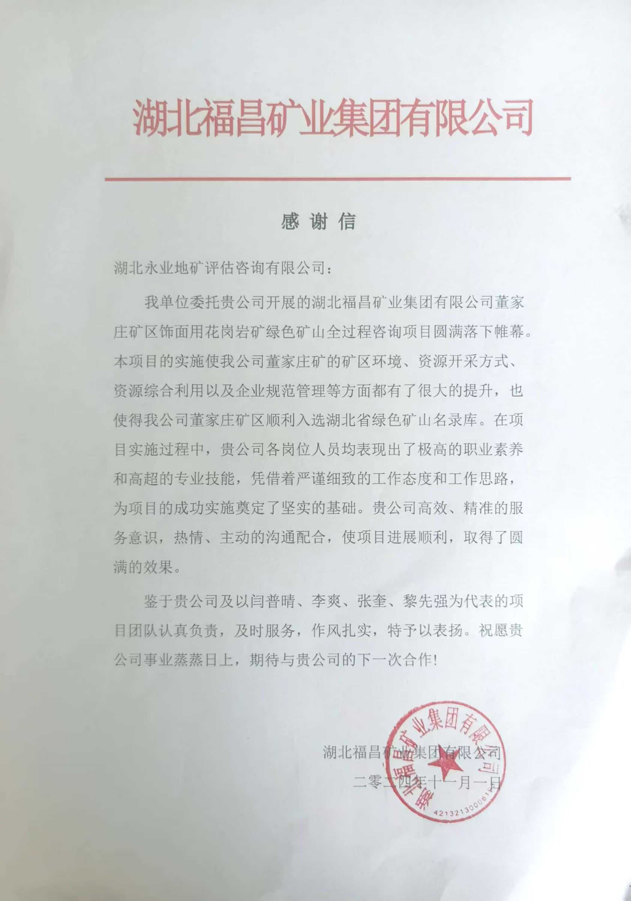 近日,永業(yè)行憑借卓越的專業(yè)服務(wù)和深厚的行業(yè)積淀,助力湖北福昌礦業(yè)集團有限公司(下稱“福昌礦業(yè)”)董家莊礦區(qū)入選湖北省“省級綠色礦山”。2024年11月1日,福昌礦業(yè)致函永業(yè)行,對我司承擔(dān)的綠色礦山全過程咨詢服務(wù)給予肯定和感謝。