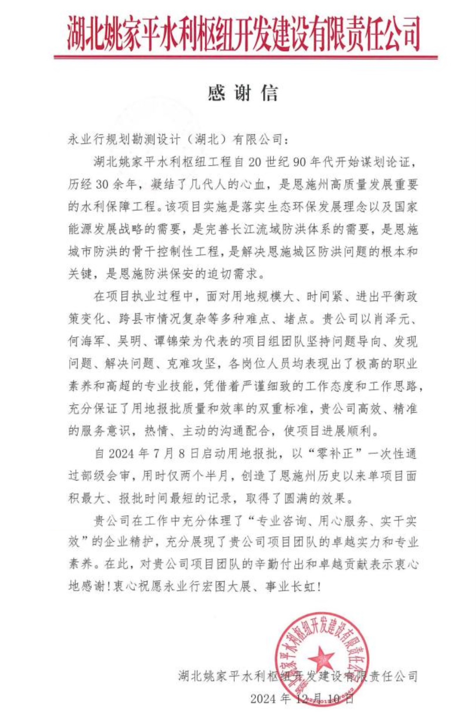 感謝信稱,湖北姚家平水利樞紐工程是恩施州高質(zhì)量發(fā)展的重要水利保障工程,凝結(jié)了幾代人的心血,該項(xiàng)目在執(zhí)業(yè)過程中面臨諸多難點(diǎn),如用地規(guī)模大、時(shí)間緊、政策變化復(fù)雜等,永業(yè)行鄂西區(qū)以肖澤元、何海軍、吳明、譚錦榮等為代表的項(xiàng)目團(tuán)隊(duì)?wèi){借嚴(yán)謹(jǐn)細(xì)致的工作態(tài)度和和工作思路充分保證了用地報(bào)批質(zhì)量和效率的雙重標(biāo)準(zhǔn),最終以“零補(bǔ)正”一次性通過部級會(huì)審,創(chuàng)造了恩施州單項(xiàng)目面積最大、報(bào)批時(shí)間最短的記錄。