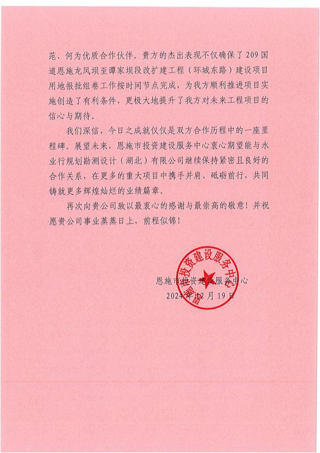 感謝信中對永業(yè)行鄂西區(qū)承擔(dān)209國道恩施龍鳳壩至譚家壩段改擴(kuò)建工程(環(huán)城東路)表達(dá)了充分的感謝,贊許了項(xiàng)目團(tuán)隊(duì)(肖澤元、何海軍)在面臨土地報(bào)批時(shí)遇到時(shí)間緊、任務(wù)重、技術(shù)難度大等問題時(shí),始終堅(jiān)守崗位、兢兢業(yè)業(yè),為搶抓節(jié)點(diǎn)窗口,主動(dòng)放棄休假,日夜奮戰(zhàn)崗位一線,展現(xiàn)出無與倫比的敬業(yè)精神和高效協(xié)作能力,團(tuán)隊(duì)內(nèi)部以及與各方之間的溝通協(xié)調(diào)順暢無阻,信息傳遞及時(shí)準(zhǔn)確,確保了問題在第一時(shí)間得到妥善處理,大大提高了工作效率,最終確保項(xiàng)目用地報(bào)批組卷工作按時(shí)完成,為項(xiàng)目的順利實(shí)施創(chuàng)造了有利條件。