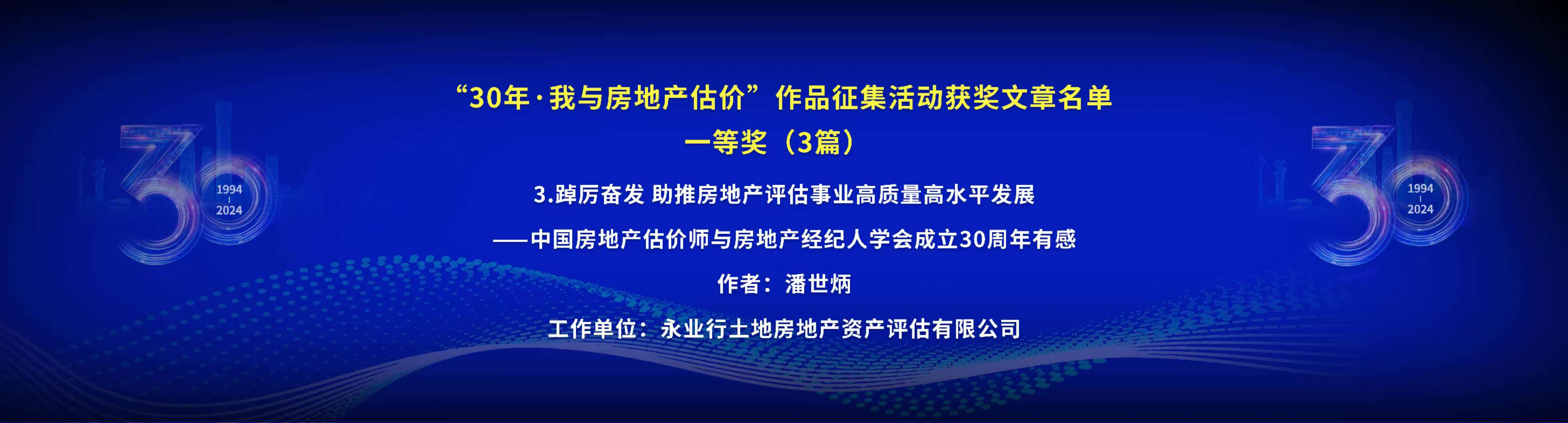 在同期開展的“30 年?我與房地產(chǎn)估價”作品征集活動中,永業(yè)行積極響應(yīng)并踴躍投稿,喜獲佳績,提報的四篇論文全部入選《中國房地產(chǎn)估價 30 年文集(征文)》。其中,由永業(yè)行黨委書記、董事長潘世炳撰寫的《踔厲奮發(fā) 助推房地產(chǎn)評估事業(yè)高質(zhì)量高水平發(fā)展 —— 中國房地產(chǎn)估價師與房地產(chǎn)經(jīng)紀(jì)人學(xué)會成立 30 周年有感》榮獲一等獎。文中不僅回顧了房地產(chǎn)估價行業(yè)從萌芽到發(fā)展壯大的艱辛歷程,更展望了未來通過深化創(chuàng)新、加速數(shù)字化轉(zhuǎn)型以及強化內(nèi)部治理等舉措,推動行業(yè)持續(xù)繁榮的美好愿景,字里行間洋溢著對行業(yè)的深厚情感與堅定信心。