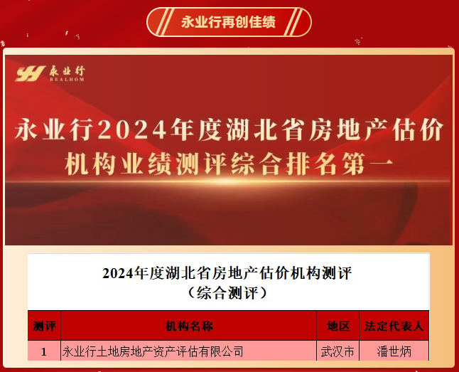 2025年6月4日,湖北省房地產(chǎn)業(yè)協(xié)會發(fā)布“2024年度湖北省房地產(chǎn)估價機構業(yè)績測評結果”,此次測評從總營業(yè)收入、房地產(chǎn)估價業(yè)務收入、咨詢業(yè)務收入、注冊房地產(chǎn)估價師人數(shù)、年納稅總額、評估建筑面積、評估土地面積、評估總價值、法人資格取得年限等9個單項指標進行多維度評估。永業(yè)行在本次測評中綜合排名第一。