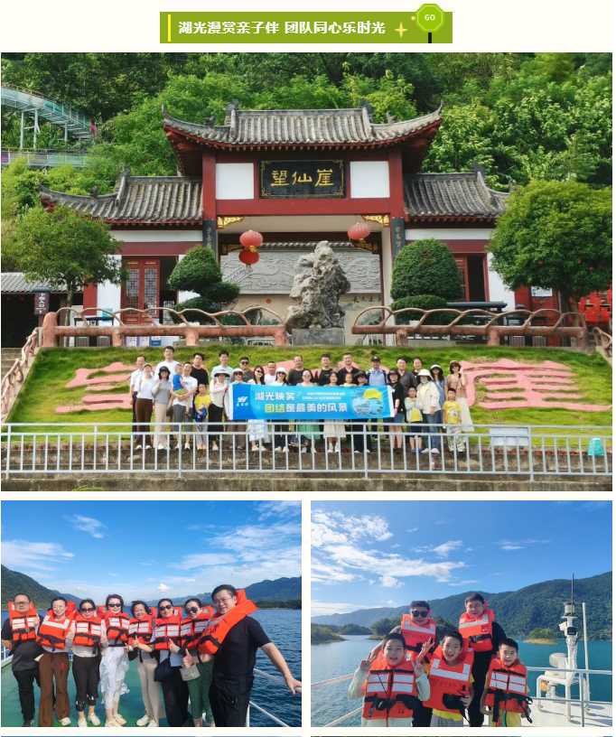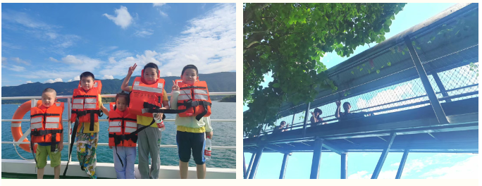 7月20日清晨,團隊乘船游覽仙島湖,碧波蕩漾的湖面送來陣陣清爽,形態(tài)各異的島嶼構(gòu)成天然畫卷,湖面清涼的微風(fēng)拂去暑氣,讓人心曠神怡。全員身著救生衣有序登船,家長將孩子護在懷中,共同聆聽導(dǎo)游講解 “望仙崖”“觀音洞” 等景點的傳說故事,親子間的溫馨低語與驚喜贊嘆交織成動人風(fēng)景。