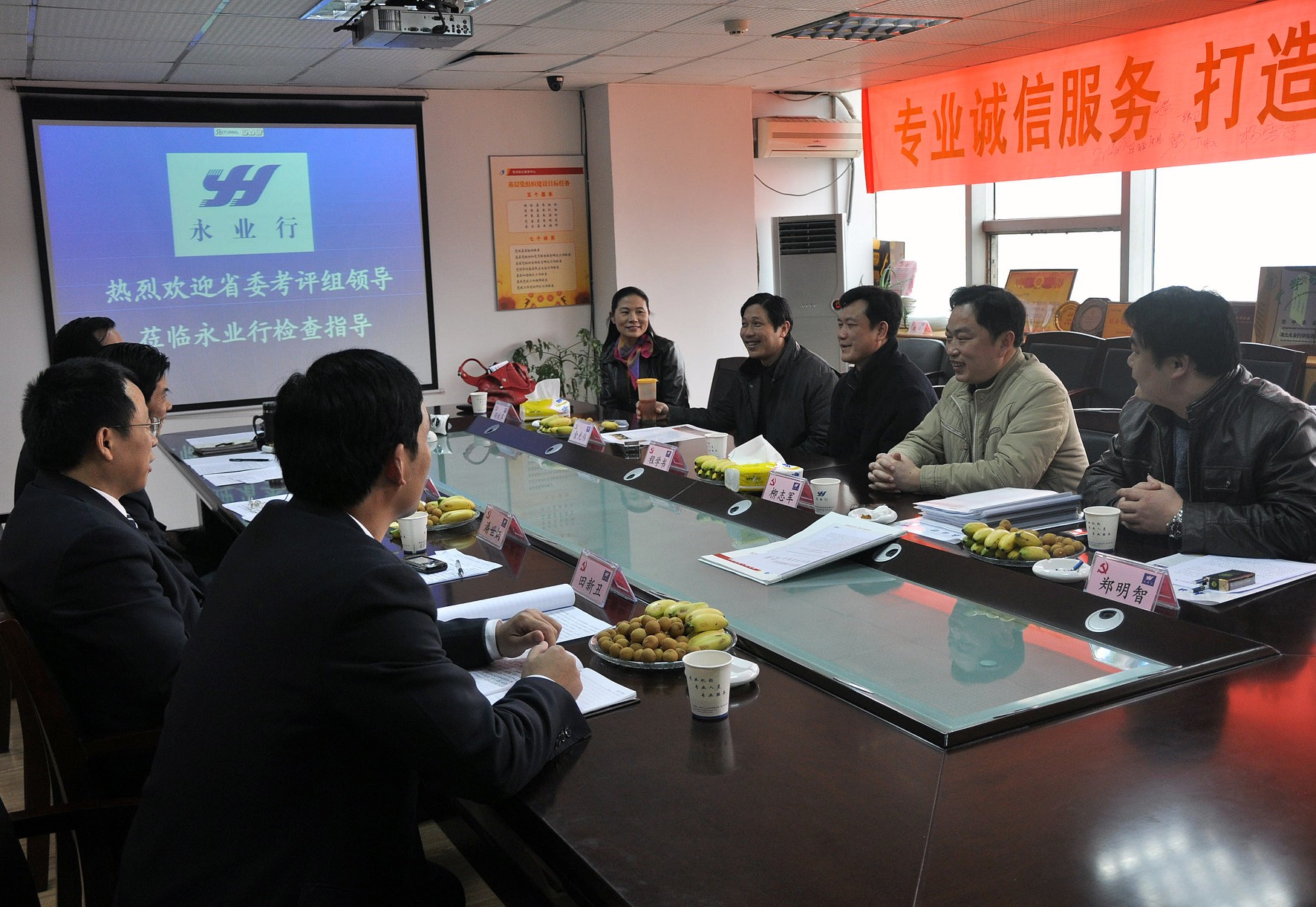 永業(yè)行黨委書記、董事長方國成,黨委副書記、總裁潘世炳,黨委副書記、副總裁靳劍輝,黨委委員、助理總裁田新丑熱情接待了省委考評組領(lǐng)導(dǎo)??荚u組觀看永業(yè)行宣傳片后,方董向考評組領(lǐng)導(dǎo)詳細(xì)介紹了公司的基本情況,匯報了永業(yè)行黨建工作;潘總對考評組領(lǐng)導(dǎo)的提問逐一作了解答和說明,并就企業(yè)黨建和組織發(fā)展等問題向考評組提出了建議??荚u組聽取工作匯報并認(rèn)真檢查永業(yè)行黨建工作有關(guān)資料后,對永業(yè)行黨建工作、創(chuàng)先爭優(yōu)活動的開展予以了充分肯定。