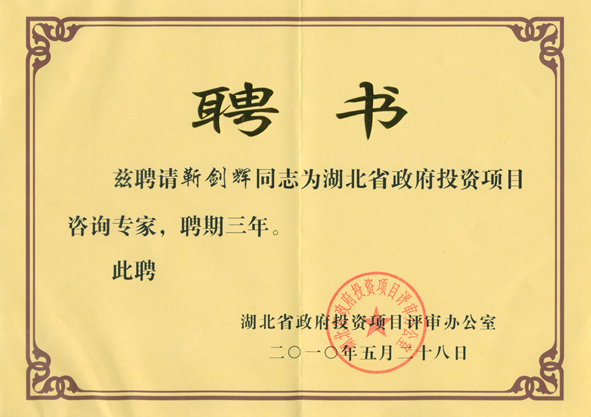 2010年6月17日,靳劍輝、劉勛濤、張曙東被聘為湖北省政府投資項目咨詢專家