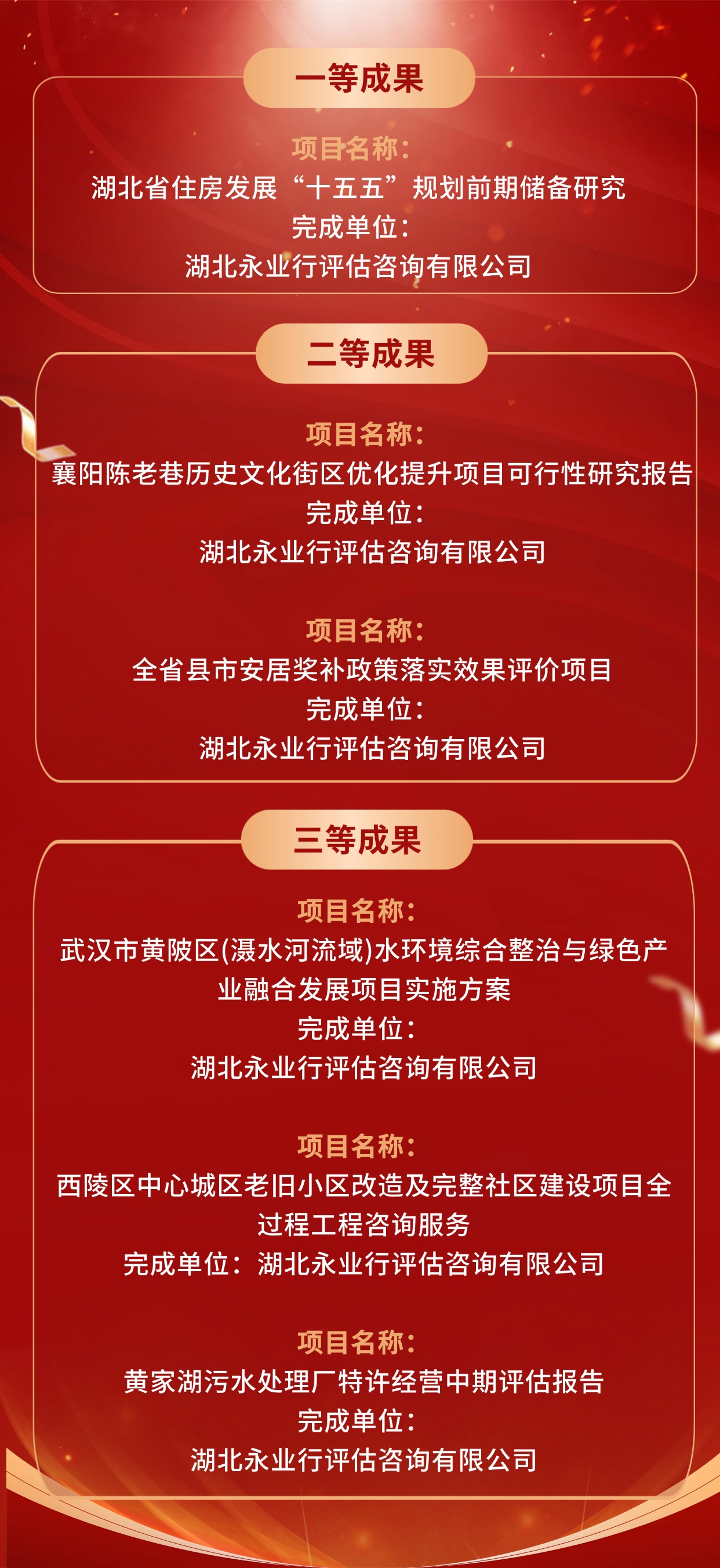 近日,湖北省工程咨詢協(xié)會發(fā)布2025年湖北省工程咨詢成果評價結(jié)果的公告,永業(yè)行憑借深厚的專業(yè)功底與創(chuàng)新的咨詢理念,共有6項成果獲得優(yōu)秀評價。