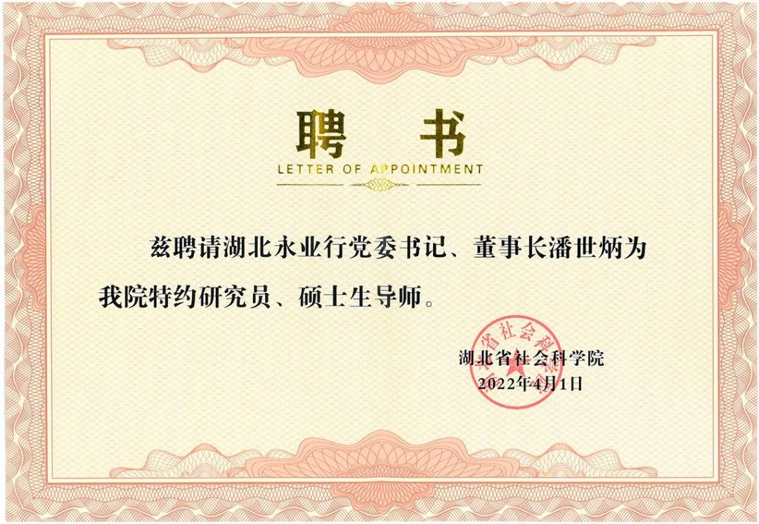 2022年4月1日,湖北省社會(huì)科學(xué)院舉行聘任儀式,永業(yè)行黨委書(shū)記、董事長(zhǎng)潘世炳博士受聘為湖北省社會(huì)科學(xué)院特約研究員、碩士生導(dǎo)師。湖北省社會(huì)科學(xué)院黨組書(shū)記張忠家向潘世炳博士頒發(fā)聘書(shū),黨組副書(shū)記、院長(zhǎng)劉光遠(yuǎn)主持聘任儀式。