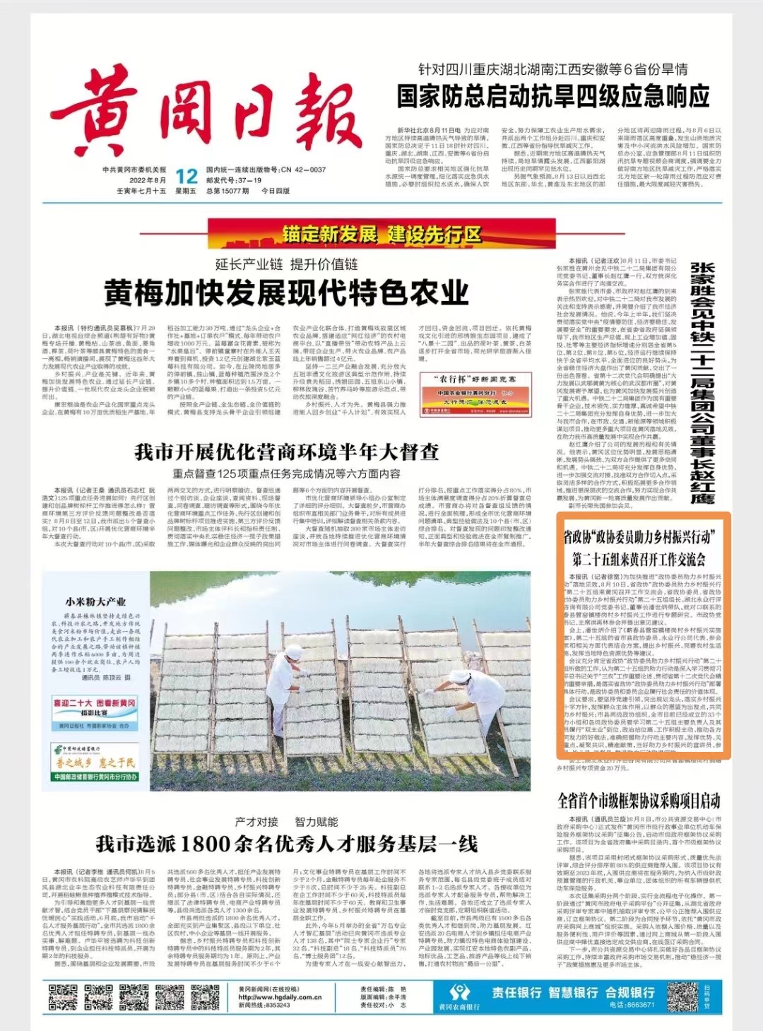 為加快推進(jìn)“政協(xié)委員助力鄉(xiāng)村振興行動(dòng)”落地見(jiàn)效,8月10日,省政協(xié)“政協(xié)委員助力鄉(xiāng)村振興行動(dòng)”第二十五組來(lái)黃岡召開(kāi)工作交流會(huì),省政協(xié)委員、省政協(xié)“政協(xié)委員助力鄉(xiāng)村振興行動(dòng)”第二十五組組長(zhǎng)、湖北永業(yè)行評(píng)估咨詢(xún)有限公司黨委書(shū)記、董事長(zhǎng)潘世炳帶隊(duì),就對(duì)口聯(lián)系的蘄春縣管窯鎮(zhèn)樓崗村鄉(xiāng)村振興工作進(jìn)行專(zhuān)題研究。市政協(xié)黨組書(shū)記、主席洪再林參會(huì)并提出意見(jiàn)建議。