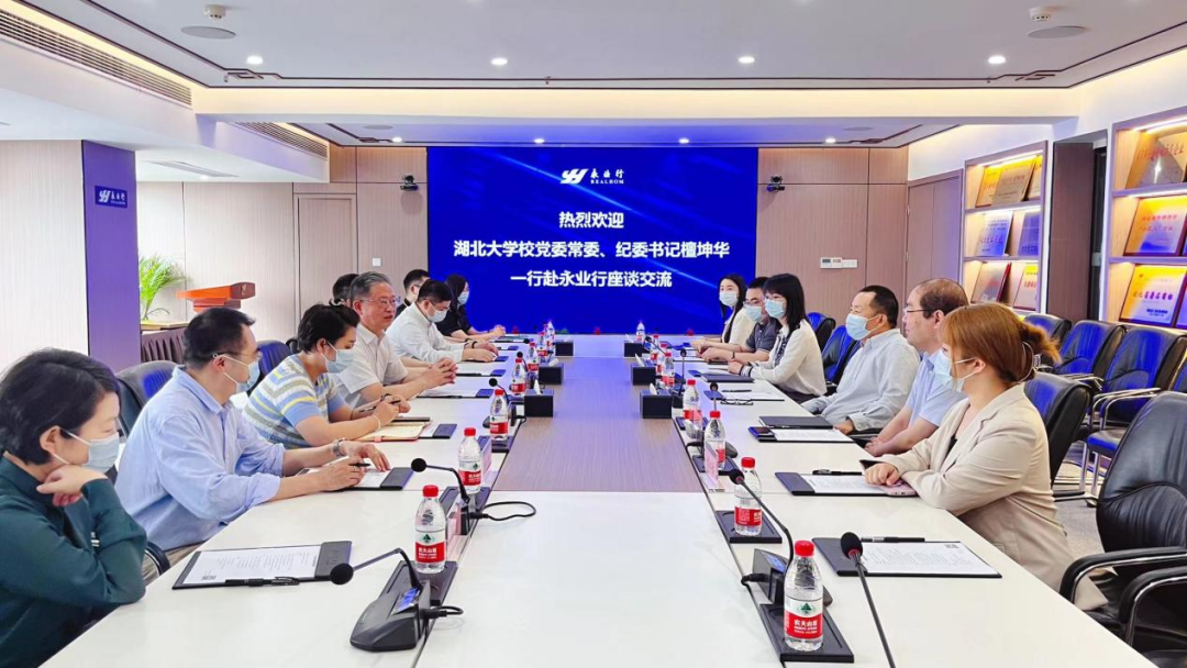 潘世炳對檀坤華一行的到來表示熱烈歡迎,他代表公司對湖北大學(xué)培養(yǎng)并輸送了大批專業(yè)務(wù)實、篤志篤行的人才表示衷心感謝。并從發(fā)展歷程、業(yè)務(wù)布局、黨團(tuán)建設(shè)、內(nèi)部管理、校企合作、發(fā)展規(guī)劃等方面介紹了永業(yè)行經(jīng)營管理情況。他提出需充分發(fā)揮學(xué)校和企業(yè)各自優(yōu)勢,建立互利共惠、可持續(xù)合作關(guān)系,共同在專業(yè)領(lǐng)域達(dá)成更高建樹,實現(xiàn)共贏。希望以本次交流為契機,在人才引進(jìn)、研發(fā)創(chuàng)新等方面深入合作。