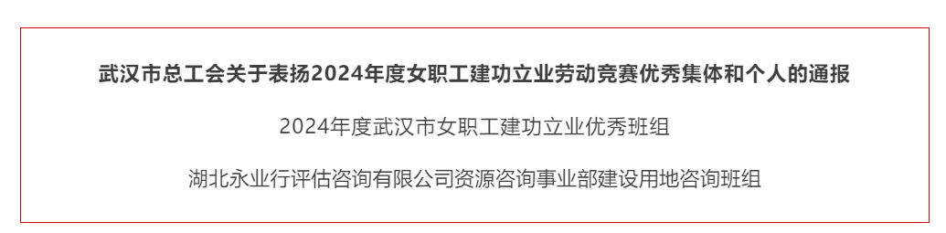 近日,武漢市總工會開展的2024年度武漢市女職工建功立業(yè)勞動競賽優(yōu)秀集體和個(gè)人評選結(jié)果揭曉,經(jīng)各級工會遴選、推薦、申報(bào)及綜合評定,湖北永業(yè)行評估咨詢有限公司資源咨詢事業(yè)部建設(shè)用地咨詢班組獲評“2024年度武漢市女職工建功立業(yè)優(yōu)秀班組”。