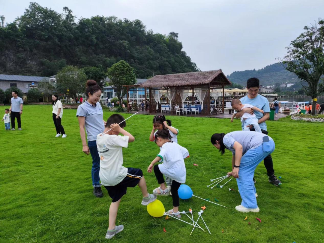 活動伊始,永業(yè)行副總裁兼鄂西區(qū)總經理雷小明向小朋友們致以節(jié)日的問候,向到場的員工家屬表示誠摯感謝?;顒訉⑿∨笥褌兎譃閮山M,家長及孩子們在默契配合下完成了瘋狂接力棒、套圈圈、拋接彈射球、瘋狂踩氣球等游戲,整個過程充滿童真,孩子們臉上洋溢著燦爛的笑容與樂園的童趣融為一體,在陽光的照耀下格外靚麗。